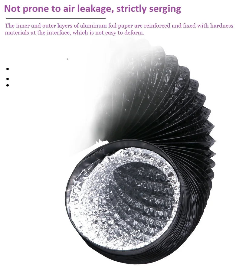 This aluminum foil pipe is wide variety of applications in ductwork system, heat filters, medical rooms, air conditioner, bathroom, greenhouse, tent grow room, air tight system and stove vent, circulating the atmosphere, air-conditioning ,Kitchen Ventilator,the removing heat from an enclosure, distributes CO2, increases temperature and humidity levels and etc.