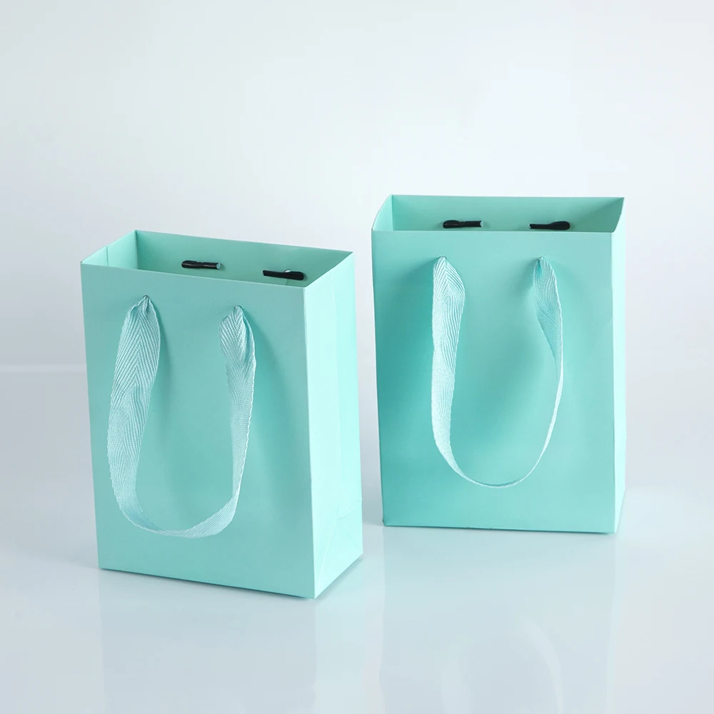 10Pack Bulk Blue White Gift Paper Bags with Ribbon Rope Kraft Handle Shopping Paper Bag 14x7x15cm Fast Food Take Away Packaging