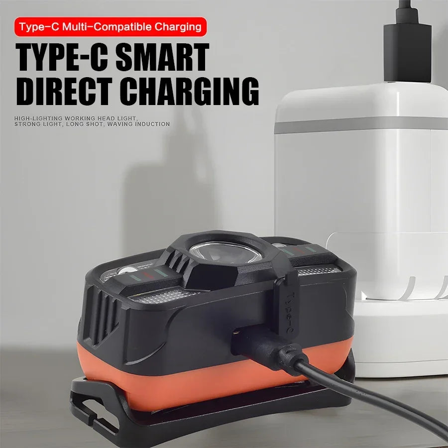 Smart IR Motion Sensor Headlamp Type-C USB Rechargeable Headlight Warning Light Waterproof Head Lamp Induction Head Flashlight