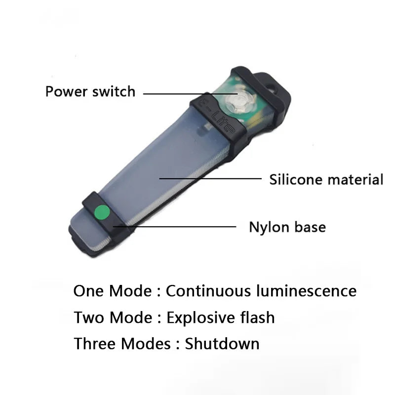 CR2032 button battery: it can last for one week in steady on mode and one month in flashing mode (the actual time will vary according to the ambient temperature).The battery can be replaced by itself after use, but it needs to be replaced by cutting the silicone, so as to lose the waterproof wrap and pay attention to the edge of the battery to avoid the contact between positive and negative electrodes.